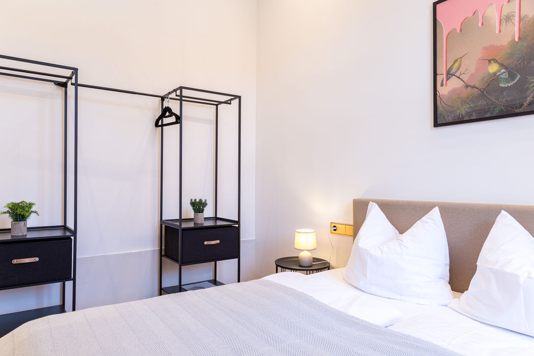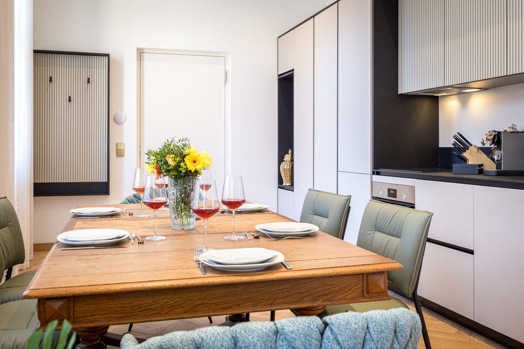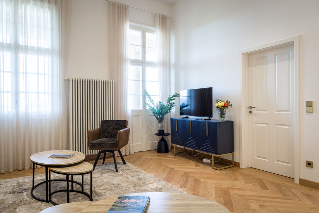 La SUITE JUNIOR N°213 (80 m²) offre un confort nettement supérieur grâce à ses deux chambres séparées – idéale pour les familles et les groupes d'amis voyageant ensemble et souhaitant préserver leur intimité. Le vaste séjour/salle à manger, lumineux et de grande qualité, est agréablement calme – parfait pour les longs séjours, les séjours de travail ou les événements d'entreprise.