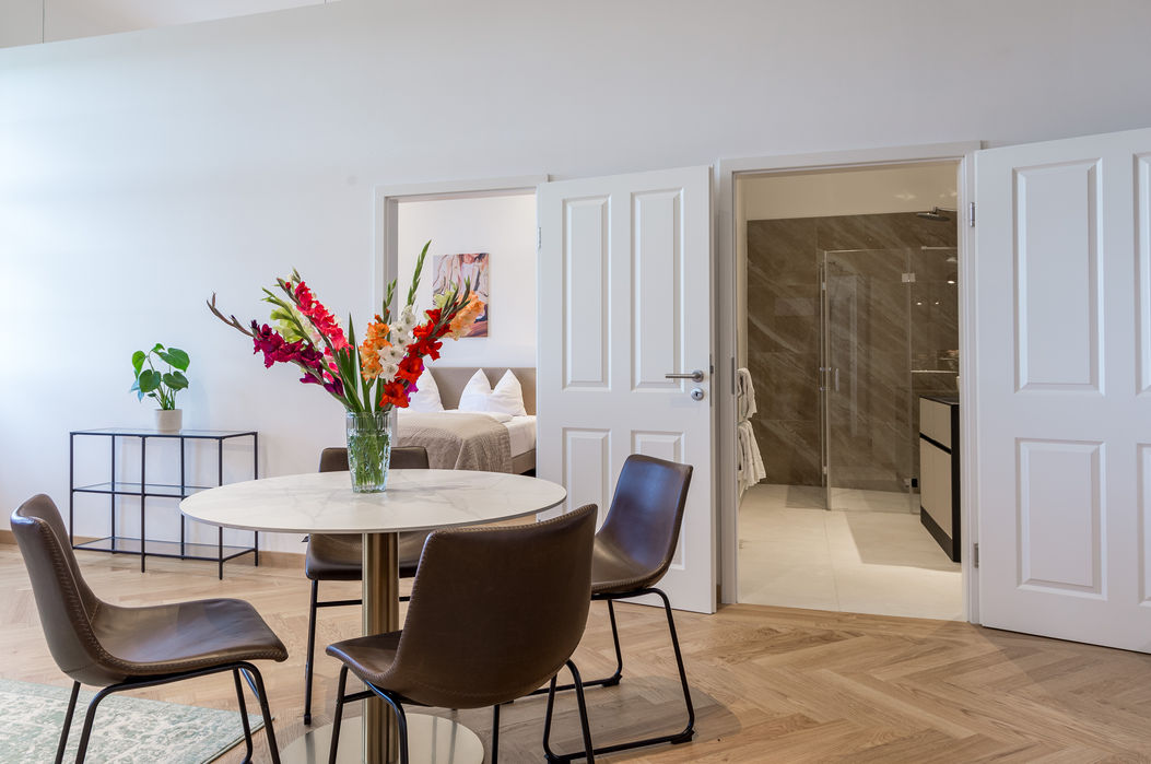 Die Premium Suite N°203 ist eine hochwertige Suite mit 1 Schlafzimmer und 60 m² Wohnfläche – ideal für 2 bis 4 Personen. Sie verbindet stilvolles Design mit einem ruhigen, komfortablen Wohngefühl und eignet sich perfekt für Paare, kleine Familien oder Gäste, die Wert auf Privatsphäre und entspanntes Ankommen legen. Auch ideal für Businessgäste oder Aufenthalte im Rahmen von Firmenevents.