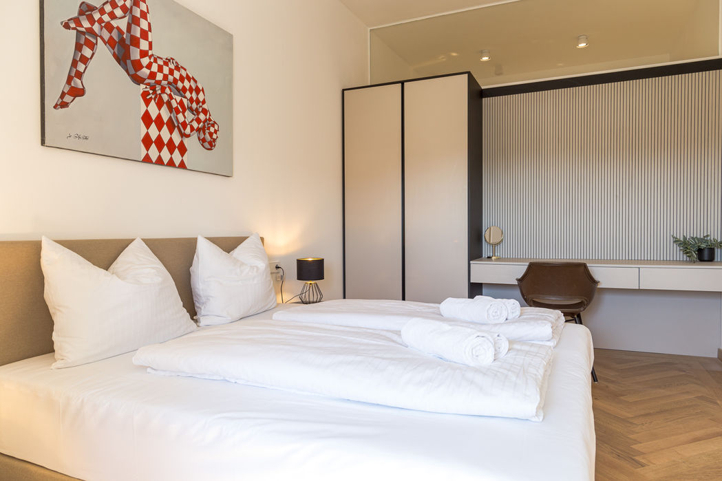 Die Standard Suite N°325 ist eine stilvolle 50 m² Suite im 3. Obergeschoss des Erlenbad Resorts und ideal für bis zu 4 Personen. Ruhig gelegen und hochwertig gestaltet, bietet sie viel Raum für erholsame Tage – perfekt für Paare, kleine Familien oder Gäste, die Komfort und Privatsphäre schätzen. Auch ideal für Businessgäste oder Aufenthalte im Rahmen von Firmenevents.